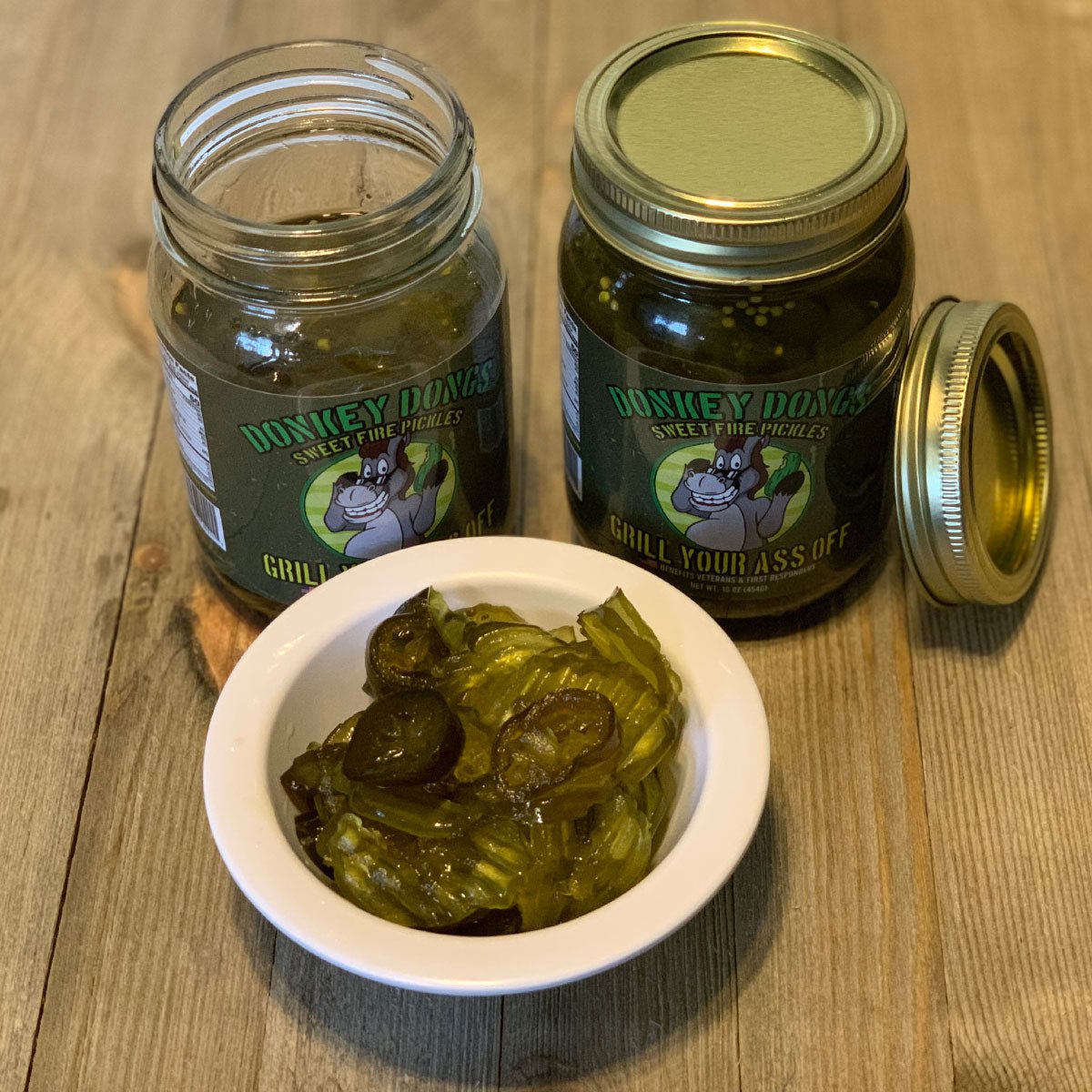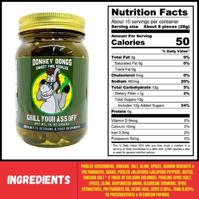 Well, these dongs are little but they have big personalities. There’s one side dish that is a must on your spread. Have a taste of the perfect pickle that has the right amount of sweet, salty, sour, and spiciness all in one bite. Our Donkey Dongs offer a tangy and refreshing nice crisp perfect for snacks, dips, and burgers. Made with the best cucumbers and jalapenos delicately packed in a zesty brine, this jar is fresh packed for a great crunch!